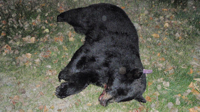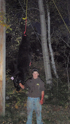 Corey was out hunting with his Bow and with his eagle eye and Robin Hood skill he took this bear yesterday morning. What a nice rug and smoked sausage it will make. Congrats!