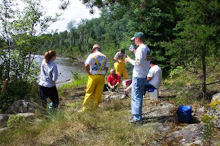 Here are a couple of pictures from several years ago when our whole family (brothers-in law, brothers, nieces and nephews) came up to camp. What fun!! The guys had a big horseshoe tournament. The other picture is shore lunch down below Long John–one of our favorite spots although the undergrowth has made it more difficult to get to in the last few years.