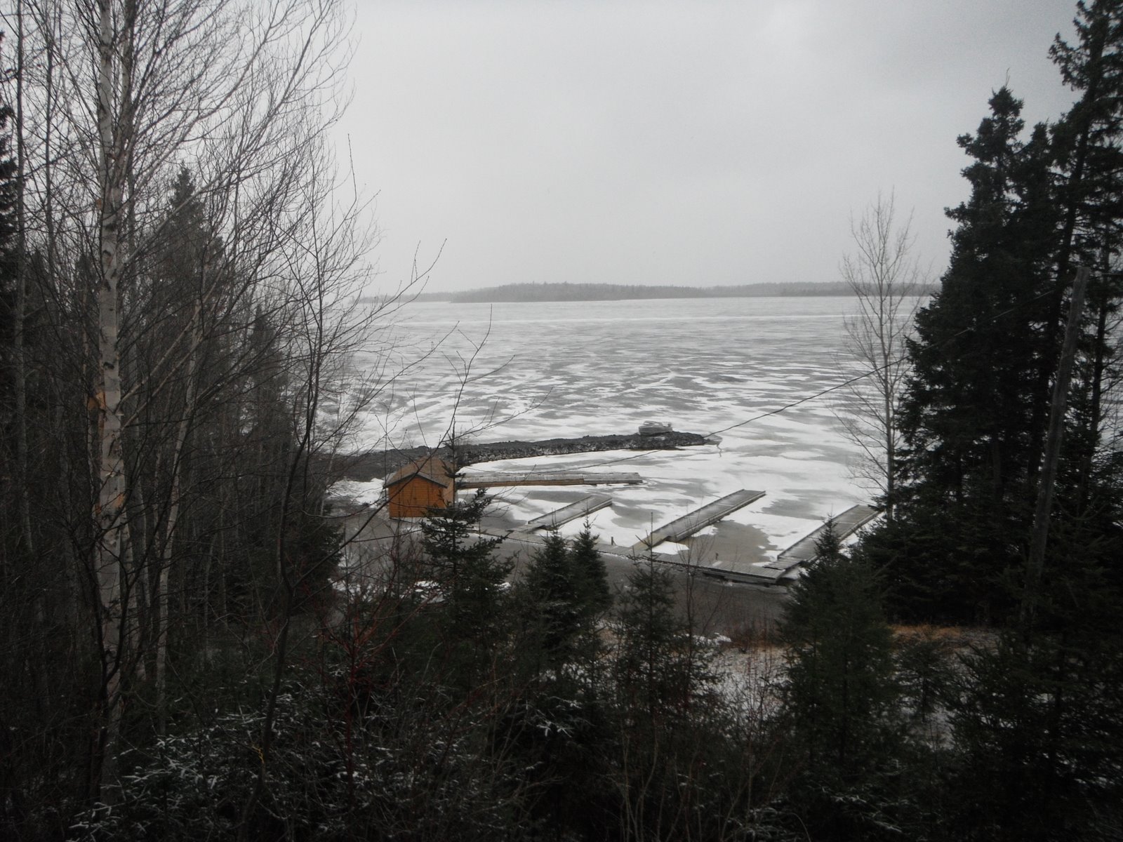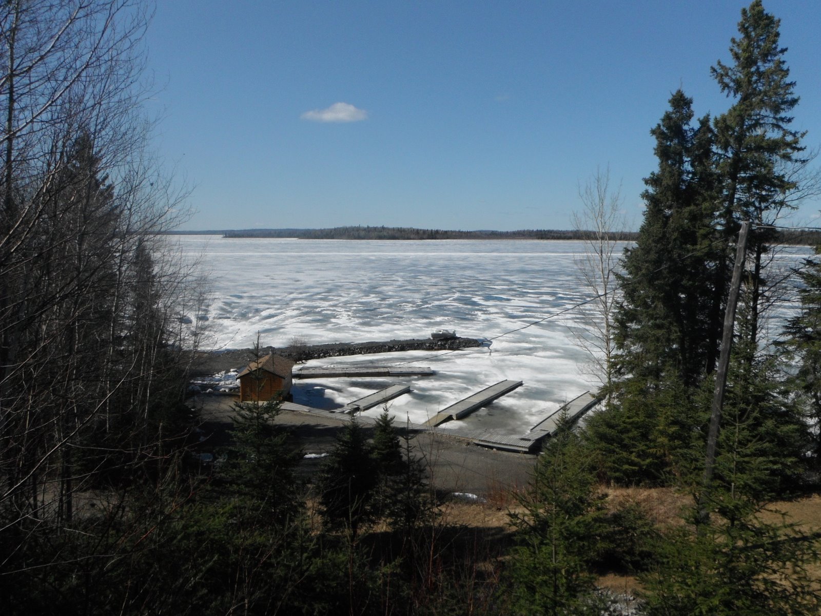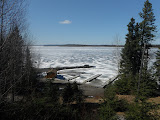 What a difference half a day makes. Cold, snow and windy yesterday night and this morning, to 10C/50F and sunny this afternoon. Pakwash Lake ice is taking a beating. It’s breaking away from the shore and some open holes are starting to show up. Bring us some hot weather and it will do the trick. My pick is May 11th and Denis is May 15th for the ice out. Anyone else have any Idea’s?