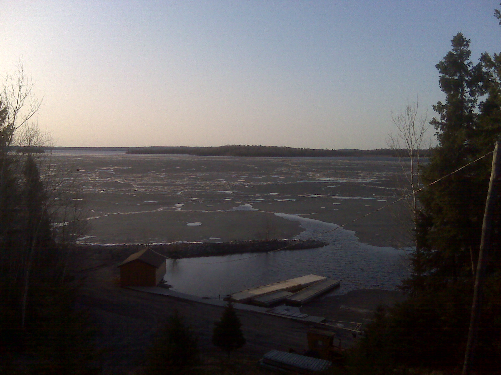 The windy day blew the ice all over today and the North End of Pakwash Lake is all open now and you guessed it. All the Ice has blown into Camp! Tomorrow or the next looks like the official Break up day!